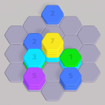 Place stacked hex tiles on the board and merge tiles of the same color by joining them side by side in this brain-teasing puzzle.